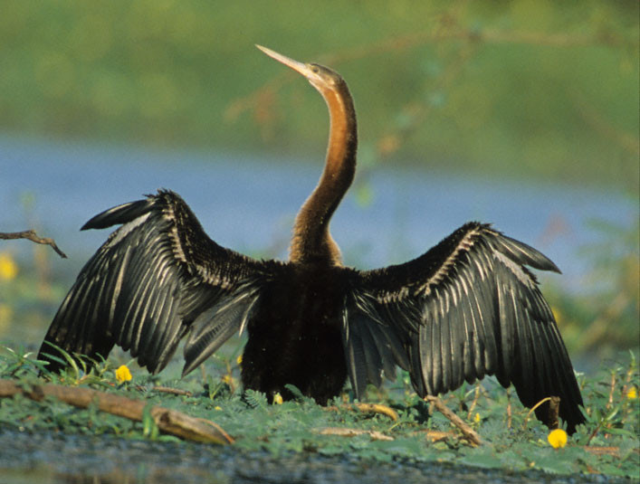 A Darter (Anhinga) drying its wings in the sun.[Zambezi River, Zambia].