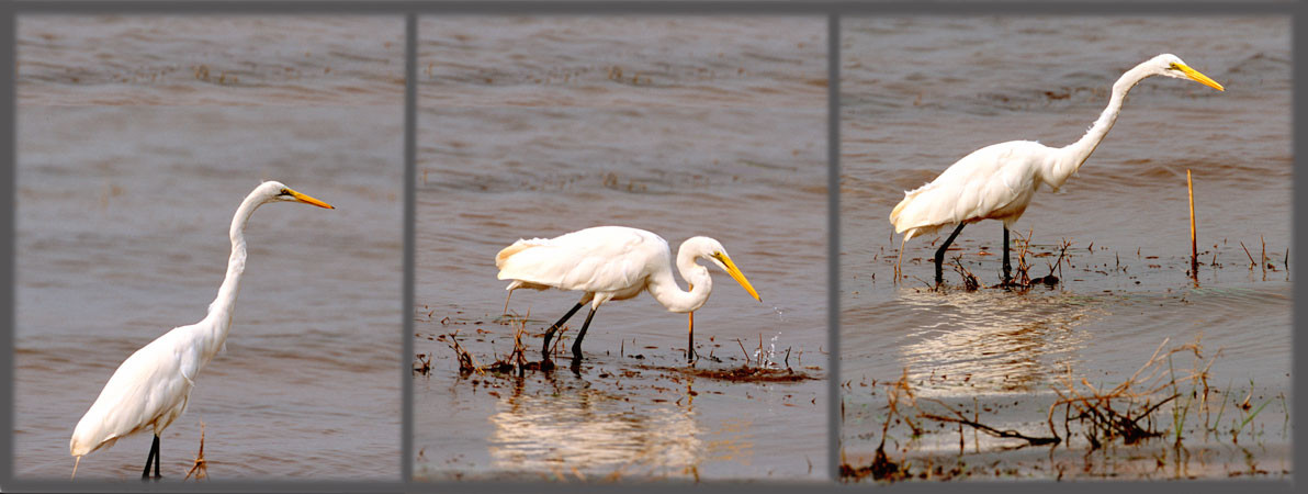 Triple image: A Great White Egret is a common, large water bird. [Botswana].