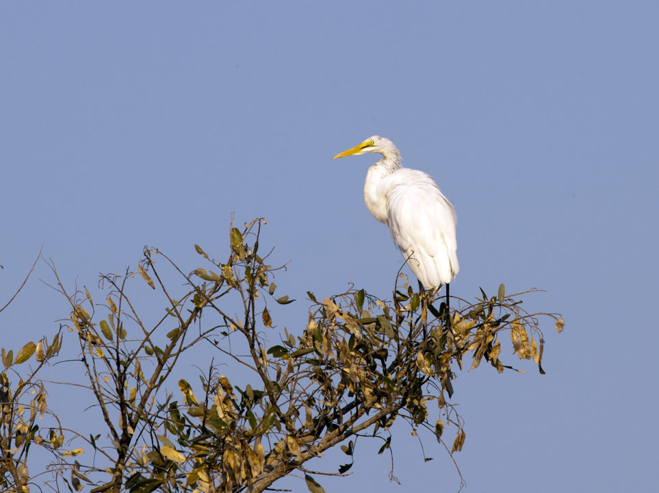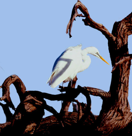 A Great White Egret: on a 'snag'--an unusual resting site during the day. [Hwange NP, Zimbabwe].