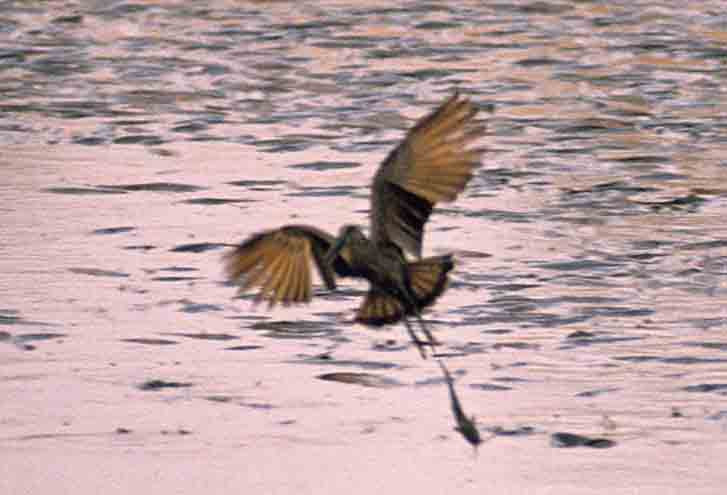This Hammerkopf is carrying off a baby catfish. The irregularities (bumps) in the water are not waves, but the bodies of myriads of catfish struggling to survive in a pond which, because of a long drought, has become too shallow to cover them . I am sure that its huge nest is nearby in the woodlands. [Deteema, Zimbabwe].