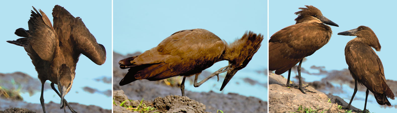 An adult Hammerkopf is a medium-sized bird who builds huge nests in trees near streams. This one is fishing. [Moremi NP, Botswana];