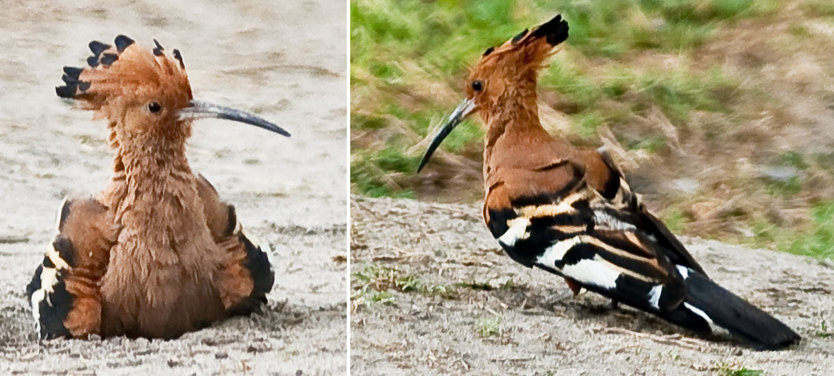 Two views of an African Hoopoe sitting in the road dust. The name derives from its 'hoop-hoop' sounding call. It seems to like a wide variety of habitats. It eats insects, worms, and small creatures. I have seen this species--or very similar species--in India. [Botswana].