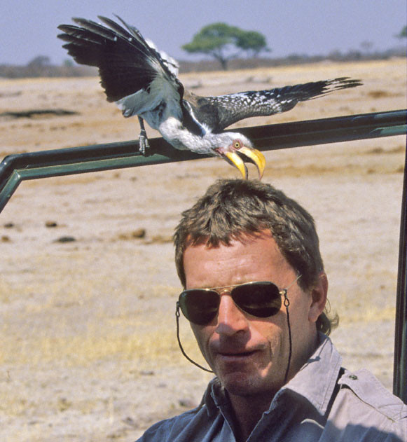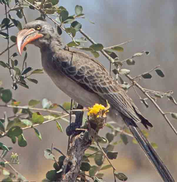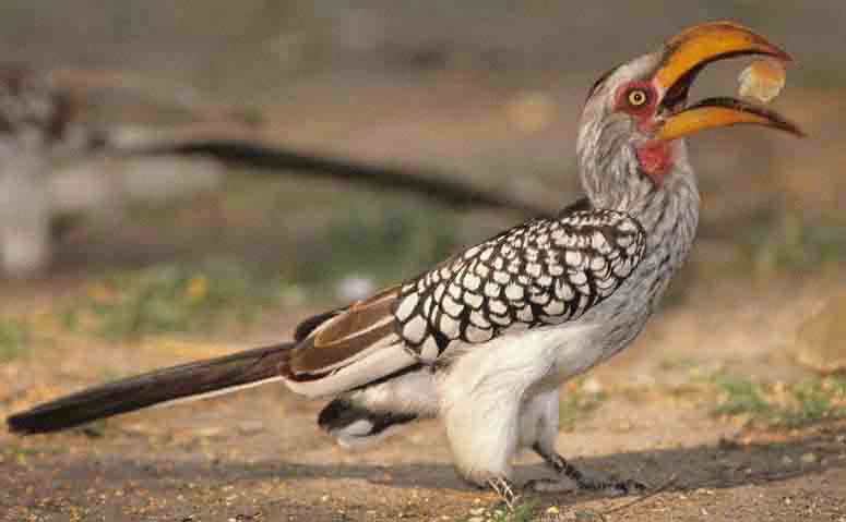 A Yellowbilled Hornbill is a frequent visitor at tourist sites where it seeks food offered by tourists or dropped on the ground. It can be quite tame.The bird has just taken a cracker placed on the top of my guide's head. [Hwange NP, Zimbabwe].