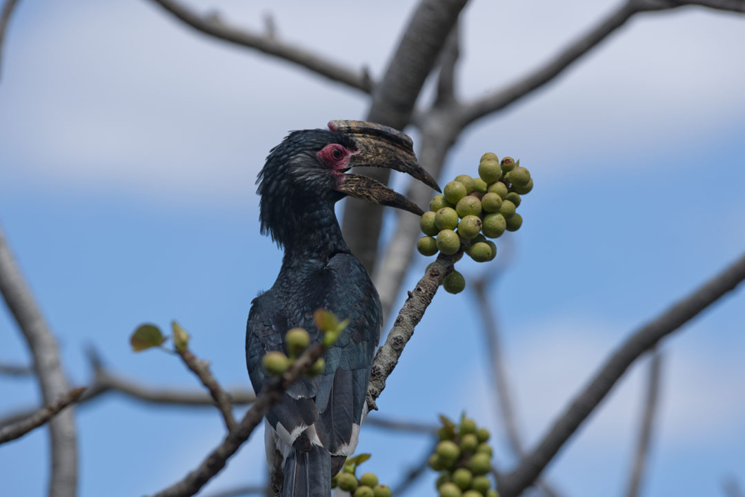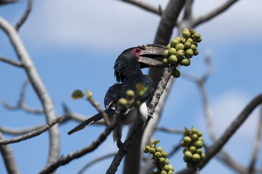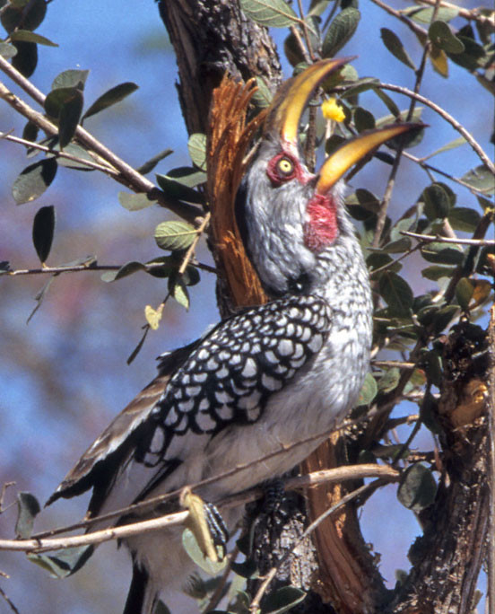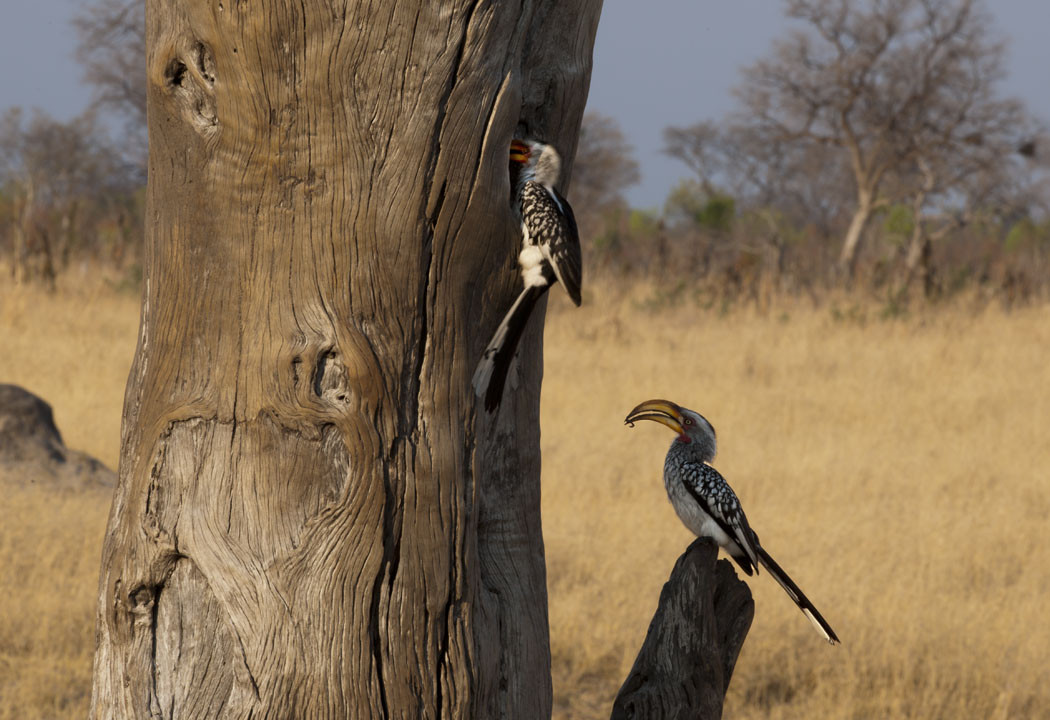 Yellowbilled Hornbills are the most common hornbill and the most accepting of human company. They are expert at flipping pieces of food (bread) down their gullets, and will accept almost everything that we eat. (Shinde Island, Botswana)