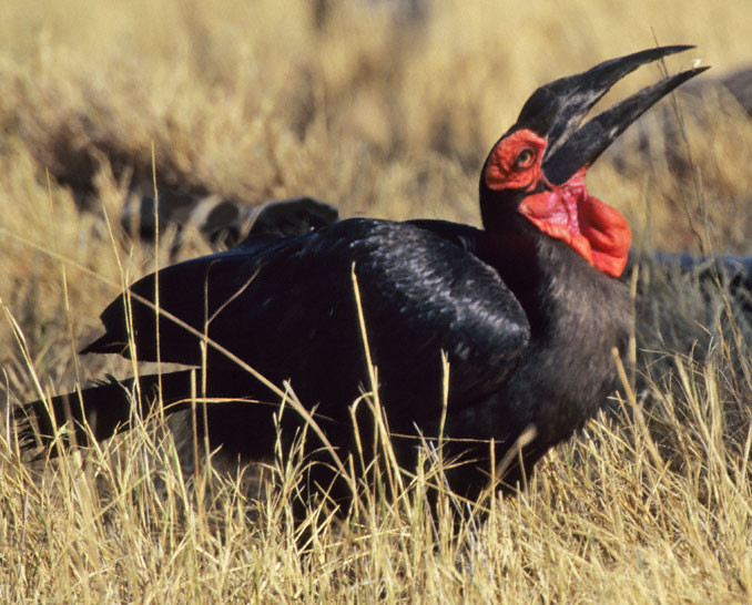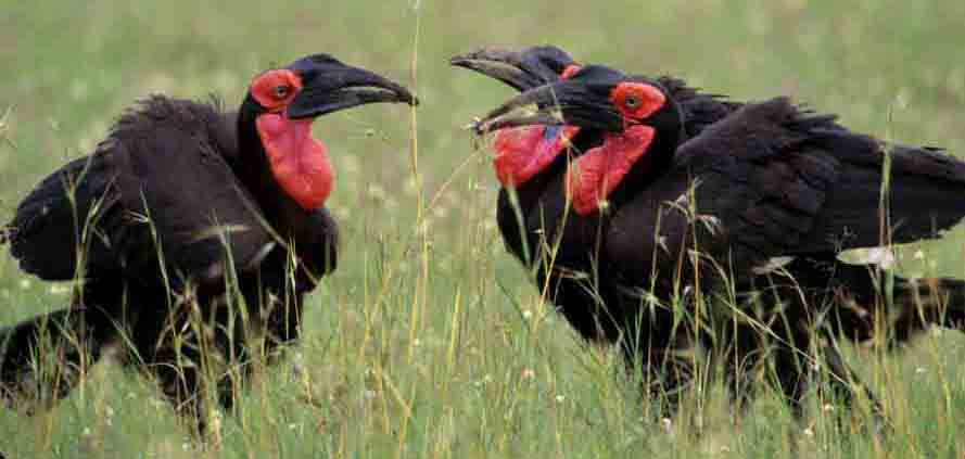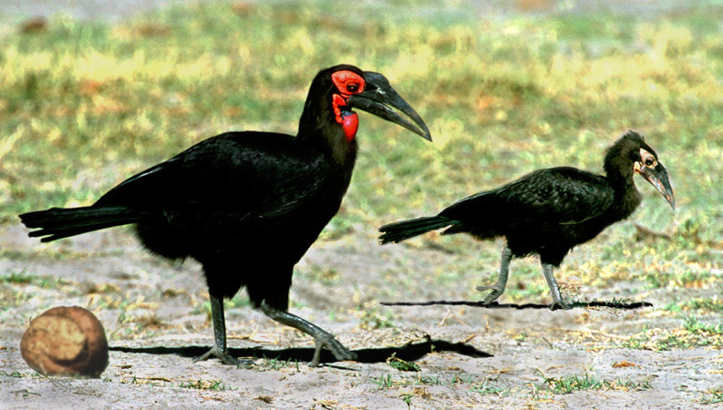 The Ground Hornbill is the largest of the hornbills. Here, two parents are out foraging with their subadult (R, behind). (Hwange NP, Zimbabwe)