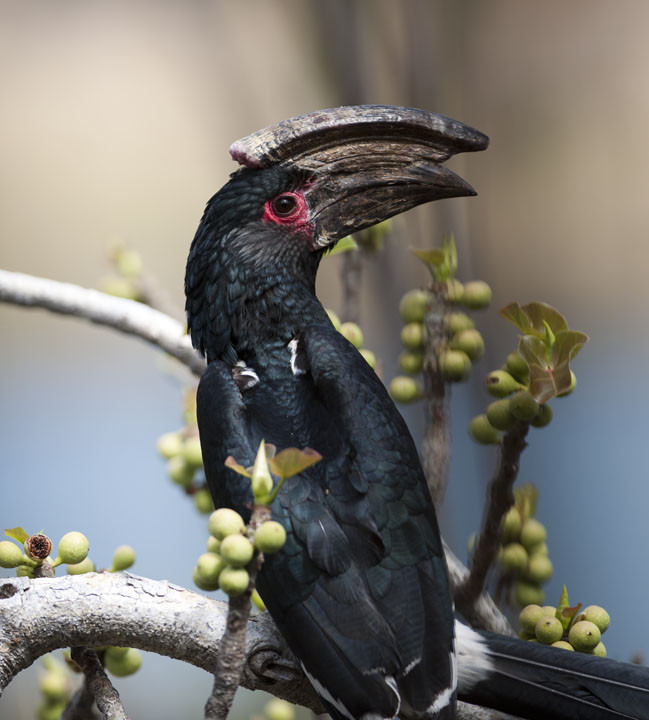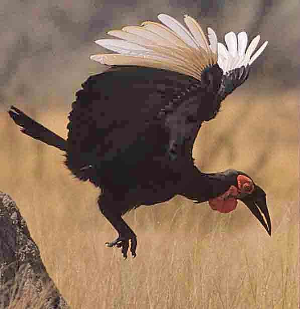 A Ground Hornbill jumping off a termite mound & displaying its white underwing. It is a beautiful sight when a group of them flies overhead. (Shinde Isl.,Botswana)