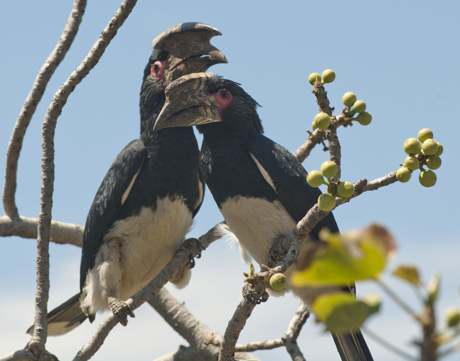 A pair of Redbilled Hornbills preparing their nest in a hollow of a dead tree. When the female is ready to lay her eggs, the male seals the entrance nearly shut with mud, leaving only a small hole through which he brings her food. This continues during incubation (24 days). She does not leave the nest until the nestlings are half grown, at which time she reseals the entrance, except for the feeding hole. The total fledgling time is 45 days). [Masai Mara, Kenya]