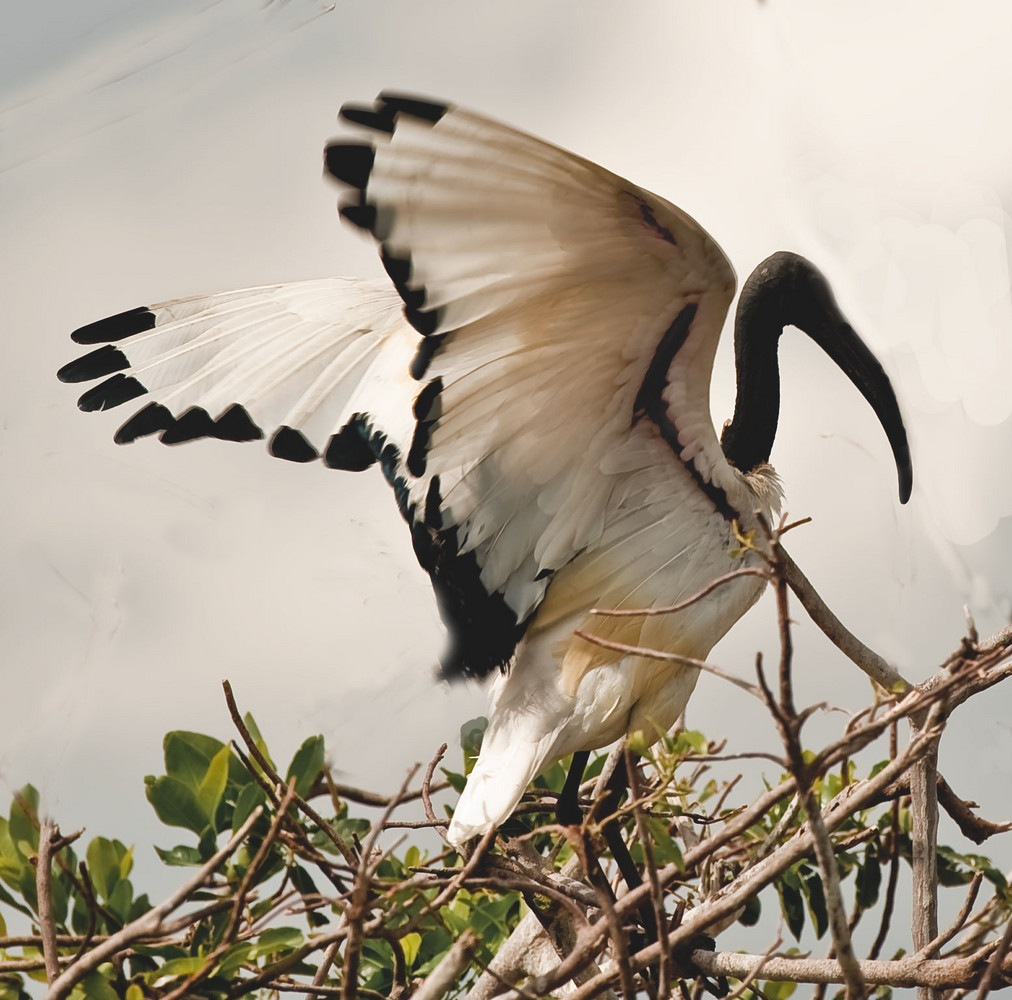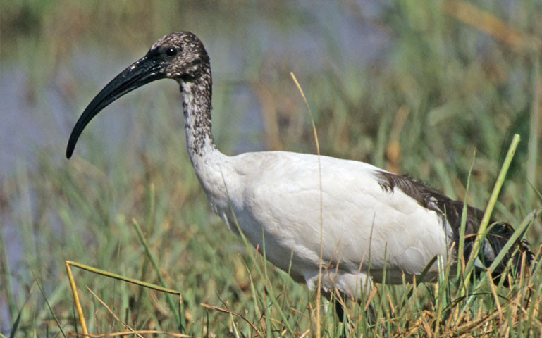 Sacred Ibis have a varied diet of insects, bird eggs, crustaceans, frogs and sometimes very small mammals. [Moremi NP, Khwai, Botswana]