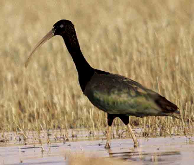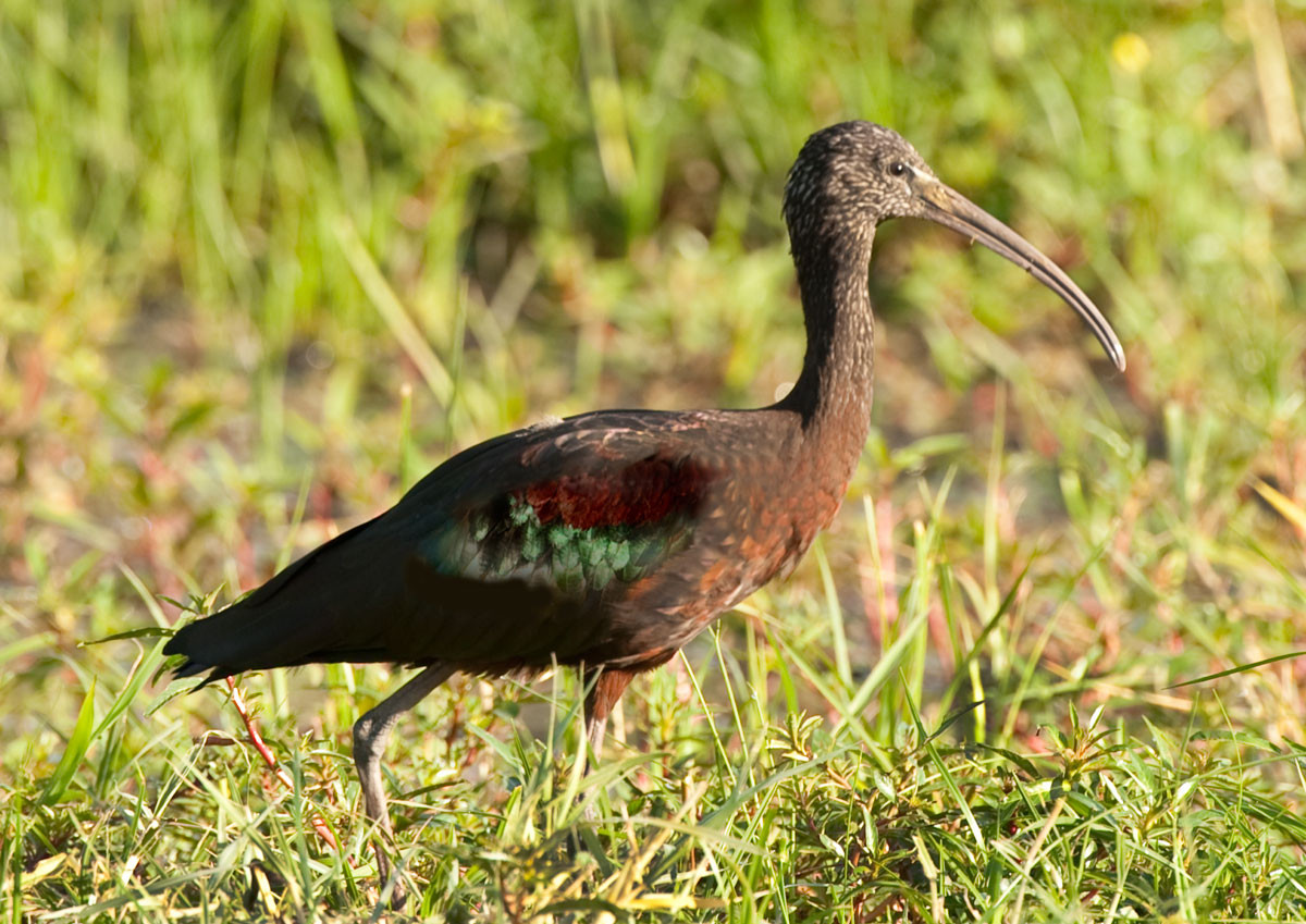 A Glossy Ibis in a swampy area, well demonstrating the greenish patch on its side. [Botswana].