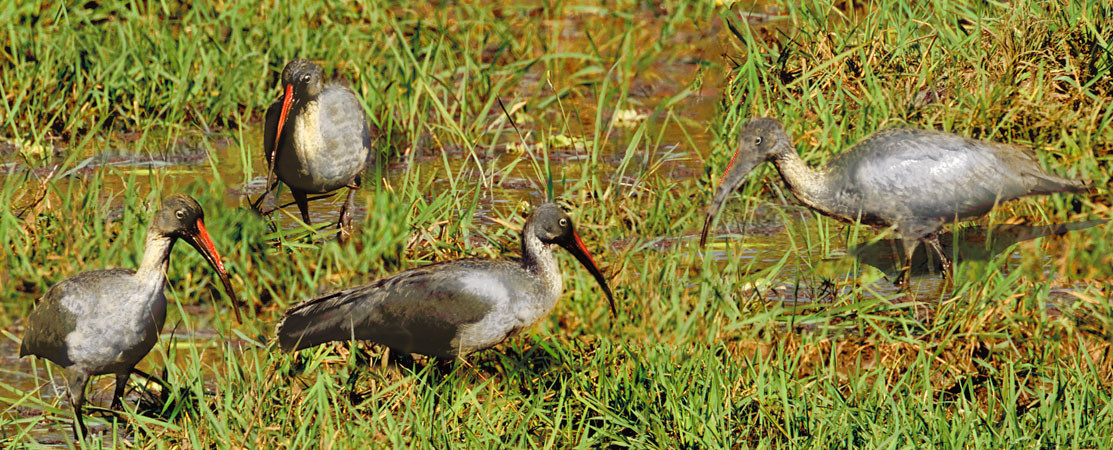A lovely view of a small group of Sacred Ibis fishing in a pond. [Khwai, Moremi NP, Botswana].