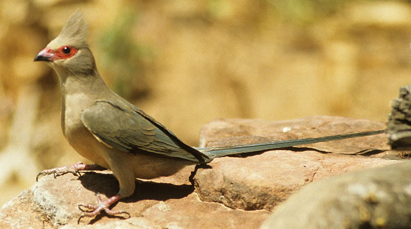 Redfaced Mousebird family: From L>R: juvenile, female, male- at a small pool. The juvenile's legs are just beginning to develop their red coloration.The bird gets its name from its long, slim tail (see picture and text of preceding image). It feeds mostly on fruit and berries. [Namibia].