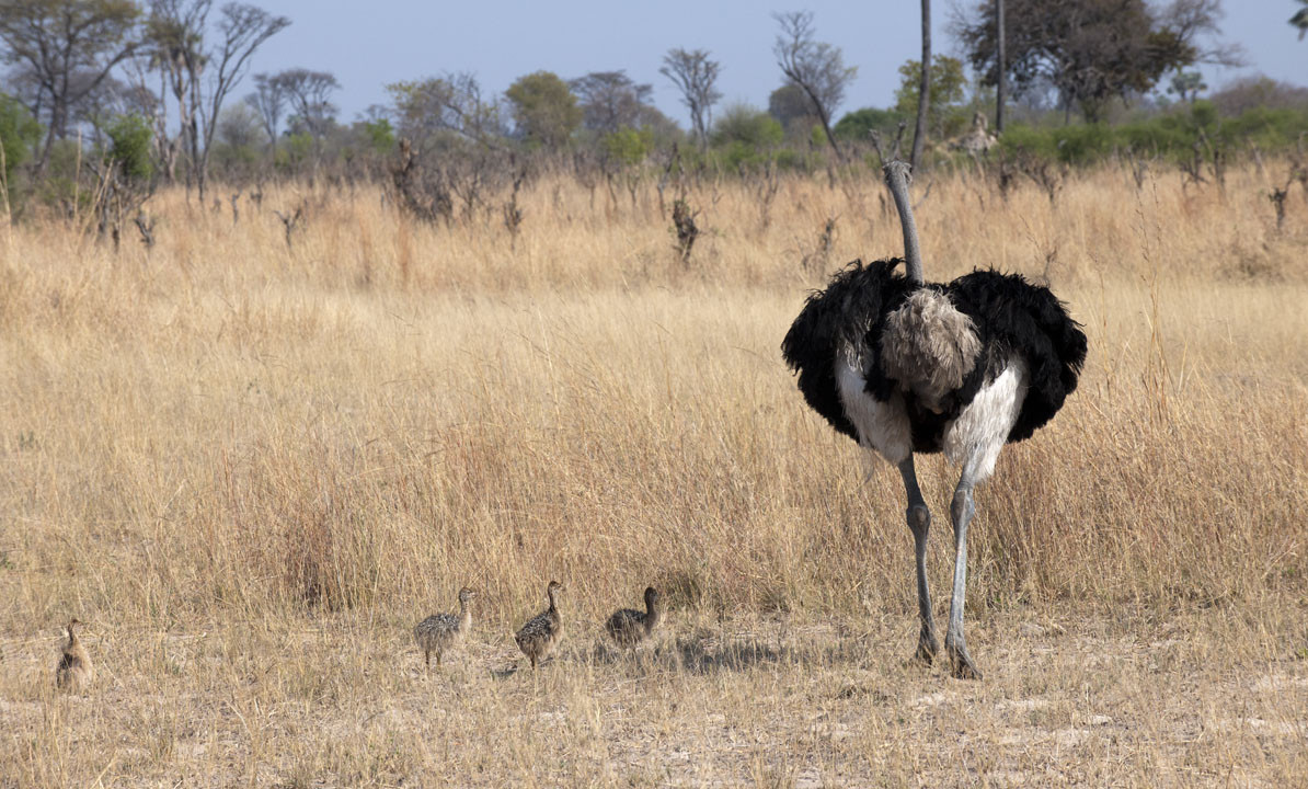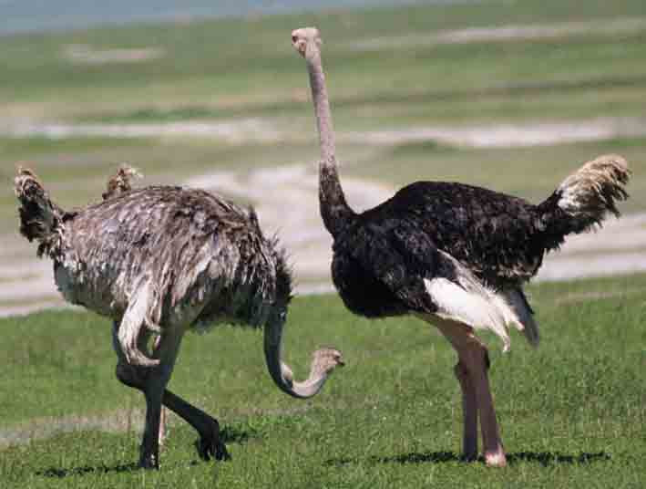 The adult ostrich male is much larger and his feathers are black, easily distinguishing him from the drab brownish color of the female. [Serengeti, Tanzania].
