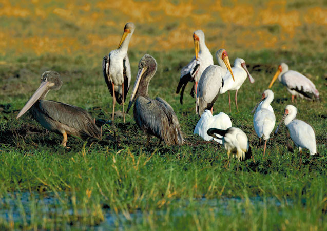 Pink-Backed Pelicans: Not the best name for this large, gray-colored bird, but in breeding season, its feathers lighten and have a more glistening appearance. The other birds are Little egrets (R, foreground) and African Spoonbills & Yellowbilled storks (R background). [Botswana].