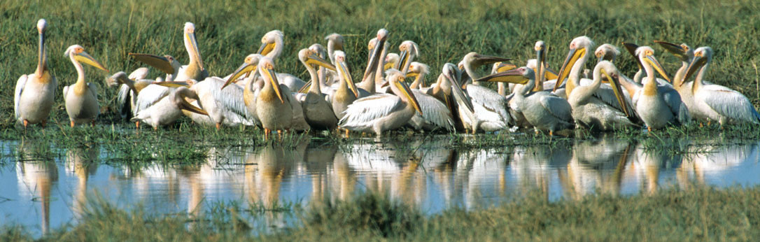 A large flock of White Pelicans, making nice reflections, while resting at a small stream. [Chobe NP, Botswana].
