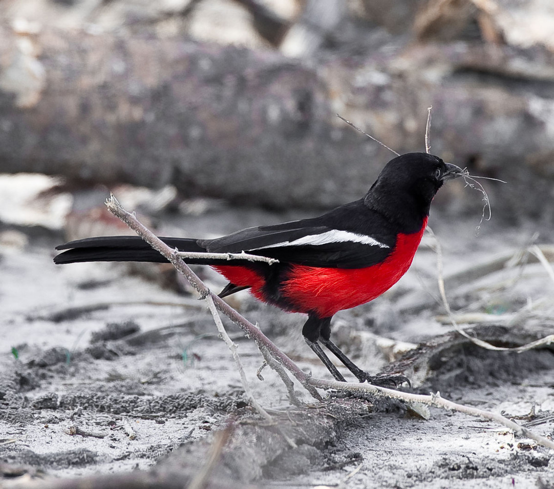 This pair of Crimsonbreasted Shrikes in the next three images are gathering small sticks to build a nest in a nearby bush. He had some of these in his beak when I took the picture. We thought that this individual was the male, because he was brighter colored, more slender, and somewhat larger. [Botswana].