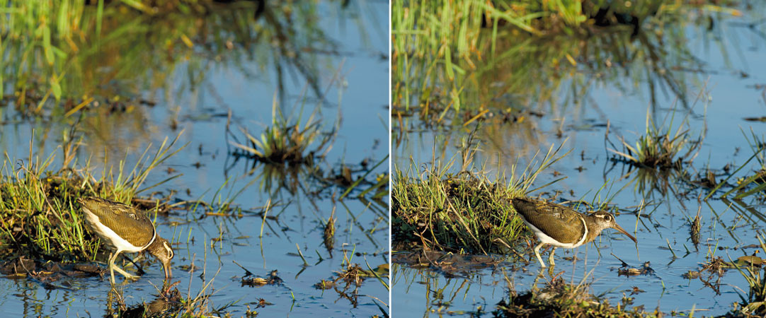 A double image: Two views of a male Painted Snipe. In this species, the female, contrarily, is the more colorful. This is the usual habitat for this bird. Its long bill facilitates searching in the mucky bottom for insects, molluscs, worms, etc.