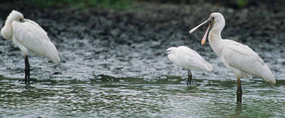 African Spoonbills resting after enjoying a meal of small mollusks (snails, clams) in the swampy water at the river's edge.