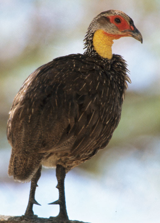 A Yellowthroated Spurfowl is so named because of the leg-spurs that are used by the males in mating fights [Masai Mara, Kenya].