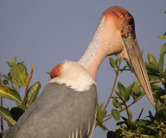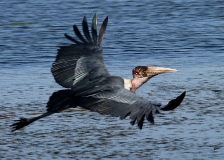 A Marabou Stork is a very large bird, and a strong flyer. It may weigh as much as 25 lbs. I once had the opportunity to stand alongside one that had become acculturated to people---its head came up to my shoulder (I'm 6 ft. tall.) The red air-sac behind his neck, and red coloration of the head indicate that this male is in his breeding colors. [Shinde Island, Botswana].