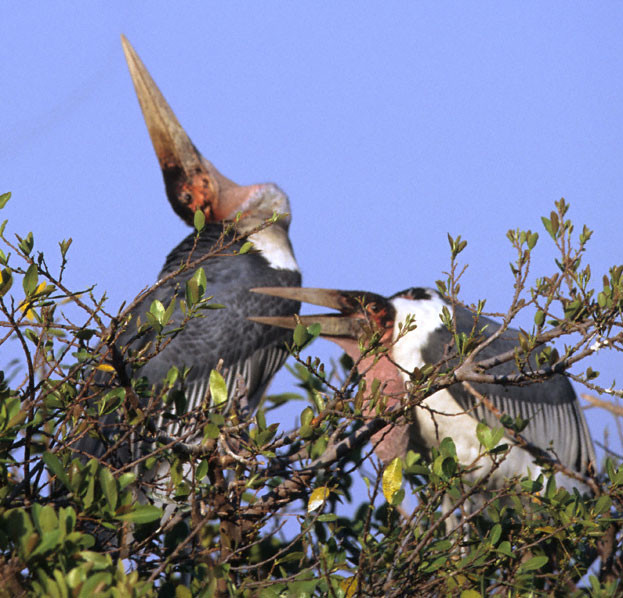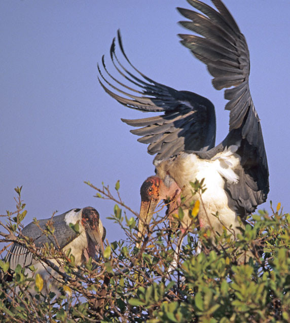 A mating pair of Marabou Storks showing the male's vigorous courting behaviour. Note the the red gular air-sac (term refers to its placement beneath the neck) is partially hidden by small branches, as is the reddened coloration of his head that occurs during breeding season. See next image. [Shinde Island area, Botswana].
