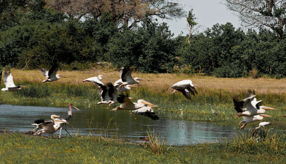 The preceding image was part of this very large gathering of Marabou Storks. There were over sixty of them! They may have come here expecting to eat, but the fish population had already been depleted by six large crocodiles [Botswana].
