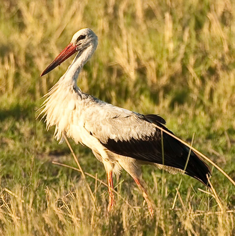 The red coloration of the legs and beak are a truer depiction of the White Stork. Its diet includes large insects, small reptiles, and the chicks of ground- nesting birds.[Botswana].