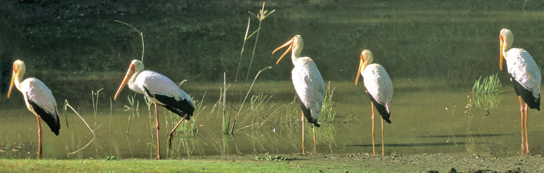 A small group of Yellowbilled Storks by the water in the late afternoon. It looks like the birds are being given a lecture by the one in the middle. [S. Luangwa NP, Zambia]