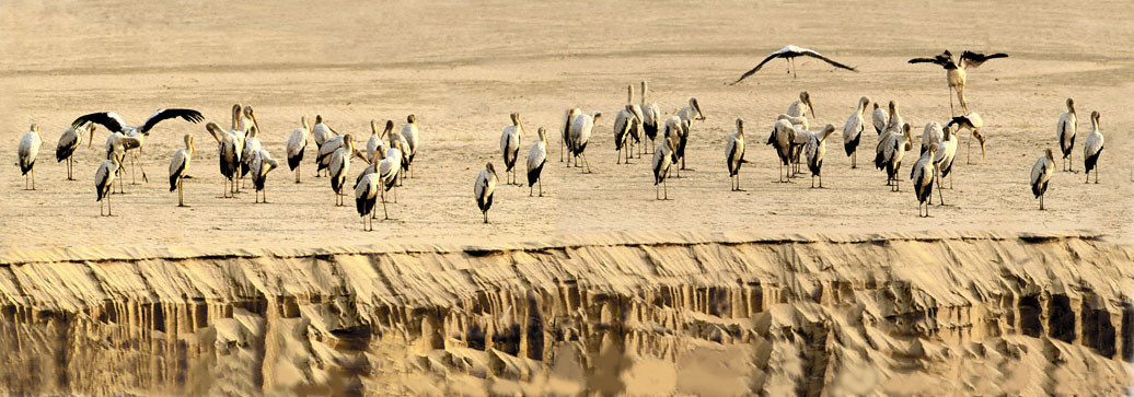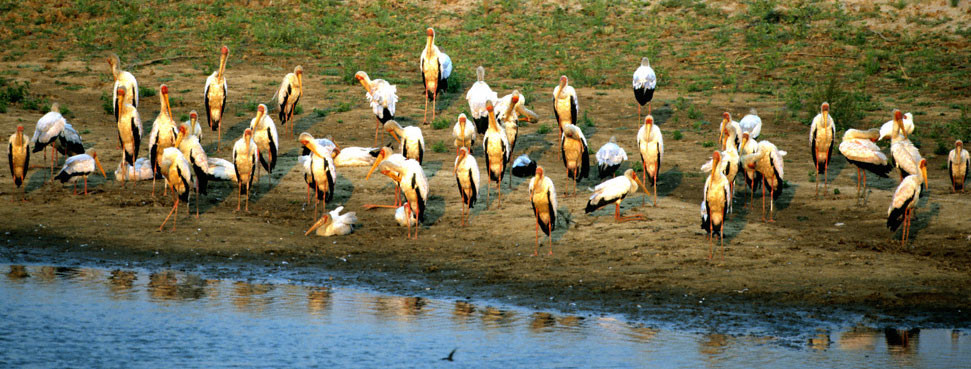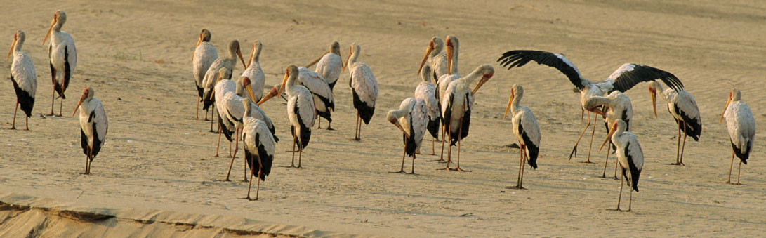 Another gathering of Yellowbilled Storks at a different spot on the river in the evening. They seem to be just resting until it turns dark, when they will seek the safety of trees nearby. [Luangwa River, Zambia].