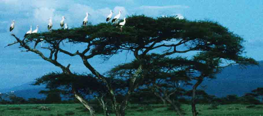 Late afternoon and the light is falling fast.The Yellowbilled Storks make an attractive sight atop an acacia tree.