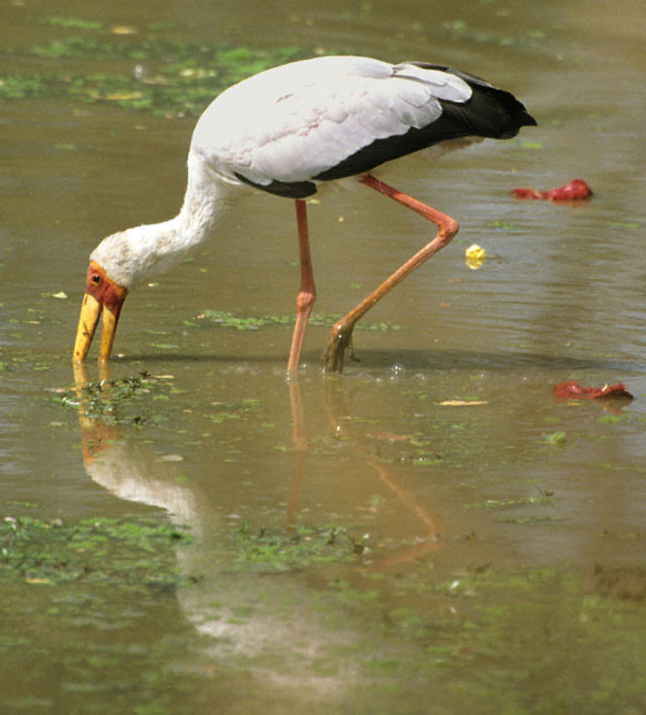 The same Yellowbilled Stork as in the preceding image, plus a lovely reflection. [South Luangwa NP. Zambia]