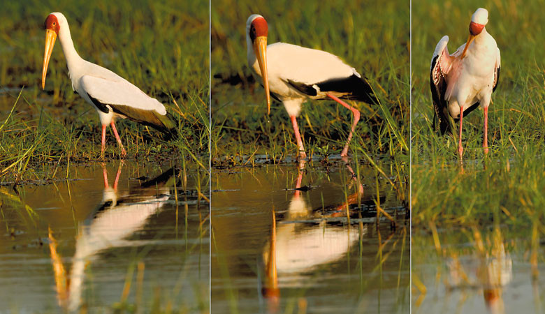 A triple image of a Yellowbilled Stork walking in the shallows of a pond: The 1st and 2nd show the side & frontal views of the head; the 3rd show it doing under-wing preening--all with lovely reflections. [Botswana].