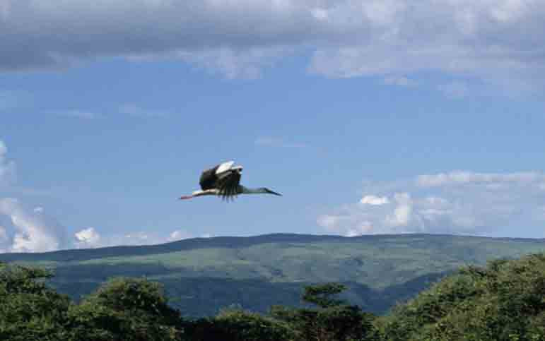 Yellowbilled Storks gathering in the late afternoon for a rest and sociability. Note the wing's-span on the one just landing. [S. Luangwa NP, Zambia].