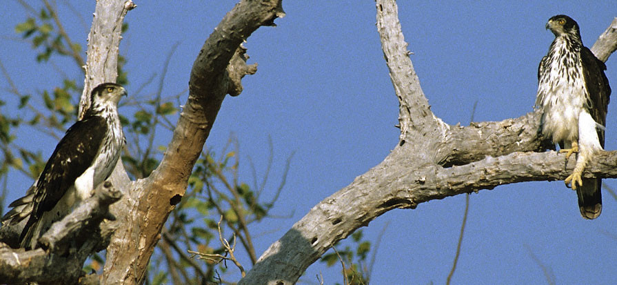 A pair of African Hawk Eagles on the limbs of a tree looking for suitable prey. This is a smallish, but very aggressive eagle, who will take small mammals, like hyrax, mongoose, etc., and birds like guineafowl and francolins. [Matusadona, Zimbabwe].