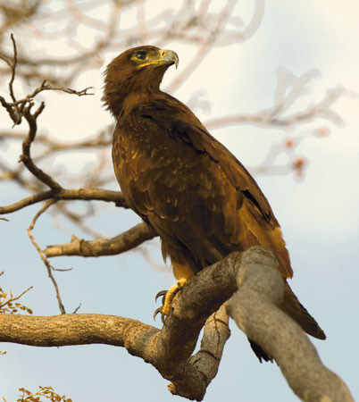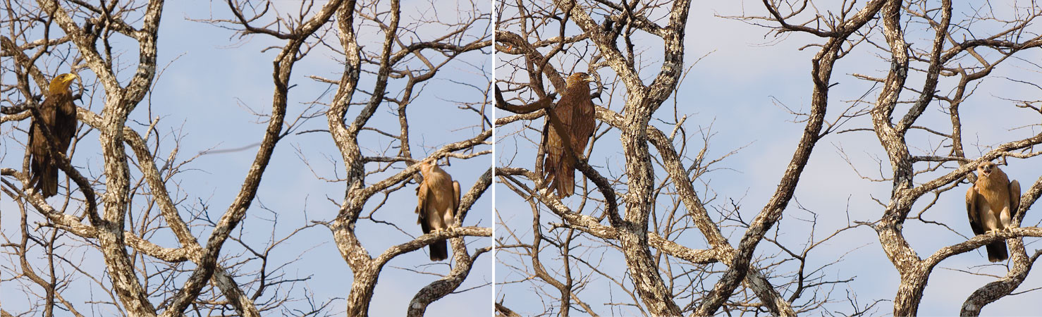 Double image: Steppe Eagle (L) & Tawny Eagle (R) in tree (both images). Both were feasting on a dead elephant. It is not uncommon over carrion to find both species present. The Steppe Eagle is slightly larger and comes from the great plains of eastern europe & central Russia especially to partake of winged-termites. They have been shown to consume 1000 or more each day the termites are flying. They are known to prey also on resting birds and small mammals.[Botswana].