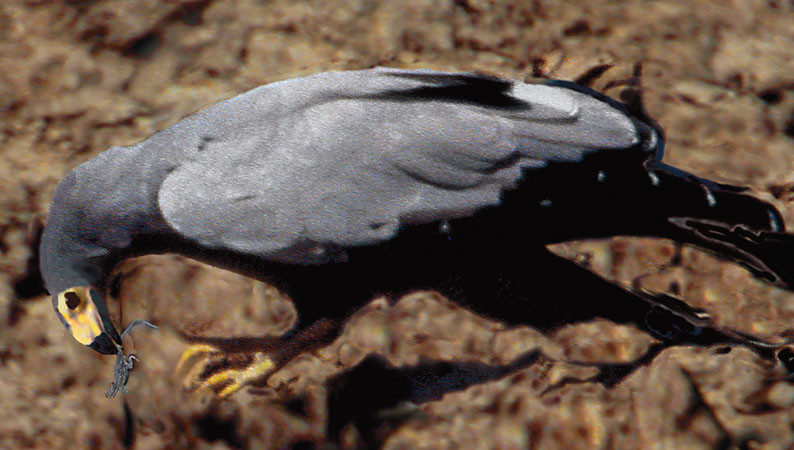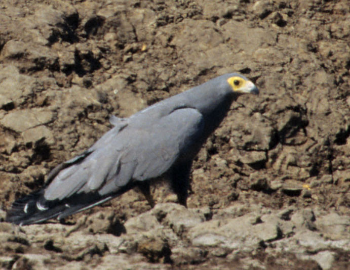 When we drove by, the Gymnogene had hold of a lizard's leg, and was working hard to pull it out of its hole. The bird must have been distracted from our presence by its effort to have breakfast, otherwise it probably would have been long gone. The latin name means 'bare face', i.e., no feathers on that part of the head. [Mono Pools, Zimbabwe].