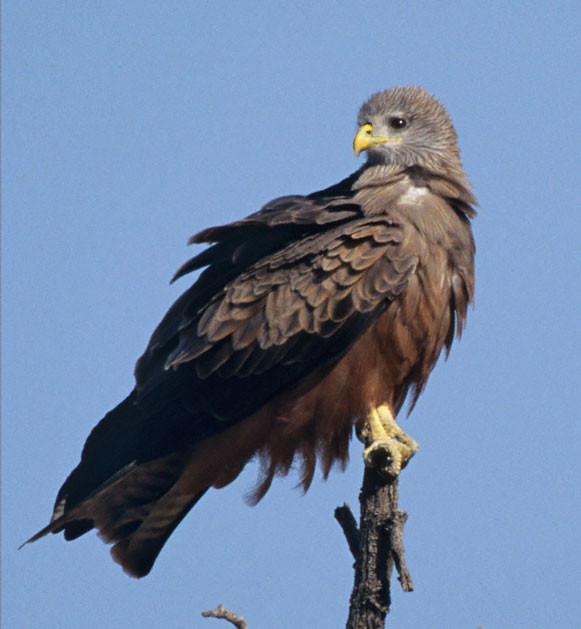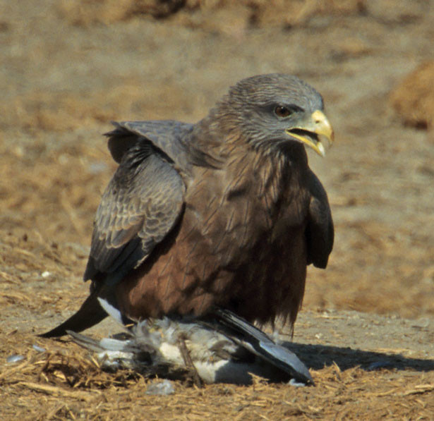 1st image: Two minutes before this picture was taken, this Yellowbilled Kite and its mate were perched in a small tree about 300 feet away from the water, where there was a large flock of doves on the sand drinking at water's edge. Suddenly, this pair of Yellowbilled kits each dove into the flock of doves and each hit one. In seconds, each had demolished a dove, leavimg only some scattered feathers. (Please see next image). [Masuma Dam, Hwange NP, Zimbabwe].