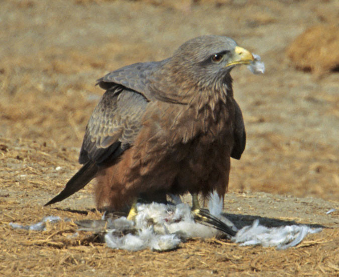 2nd image: One of the Yellowbilled Kites standing over the remains of the dove--there's not much left: only feathers and some body remnants. To view the pair post cibum, see 3rd image. [Masuma, Hwange NP, Zimbabwe].