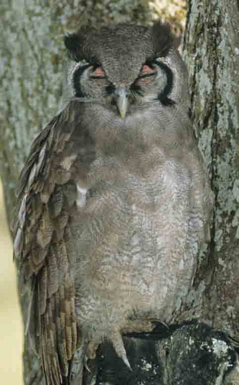 A young adult Verreaux's Eagle Owl, smaller than that in the previous image. It was early evening and its eyes are open, and so the red upper eyelashes are barely visible. It could take rabbits and hares, and fairly large birds. (Please see previous image). [Hwange NP, Zimbabwe].