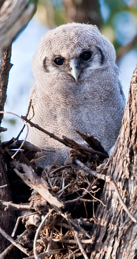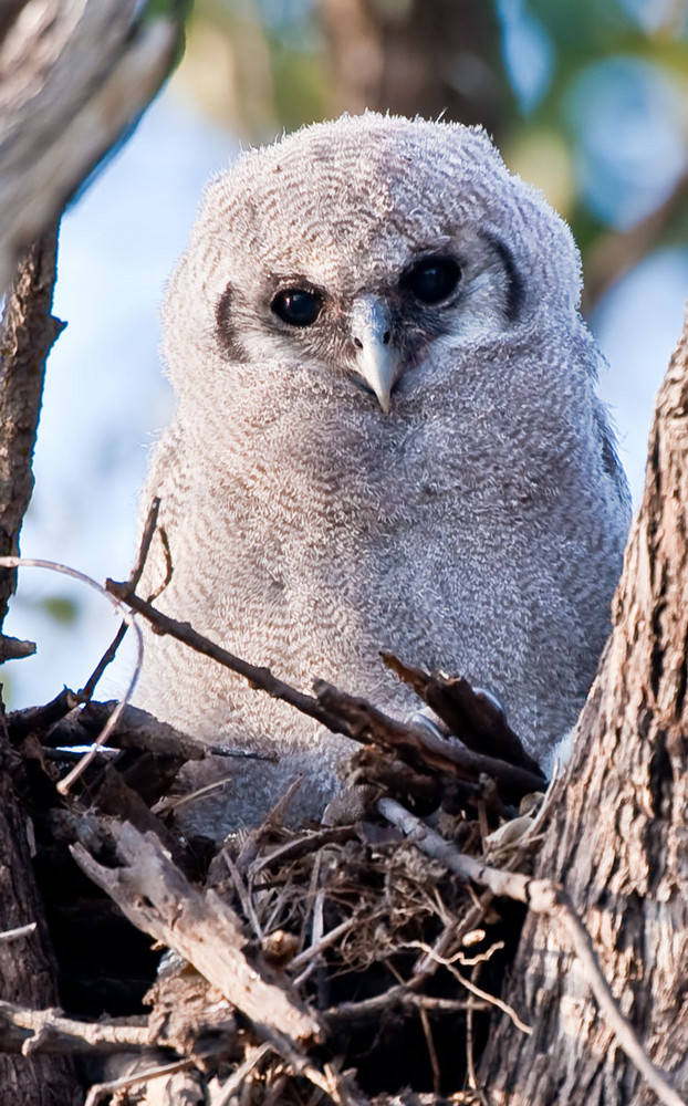 We thought that this Verreaux's Eagle Owl baby was abour 6-8 weeks old. It dutifully remained in the nest while both parents went hunting. [Botswana].