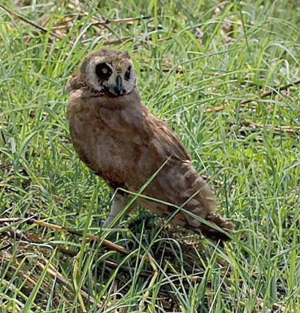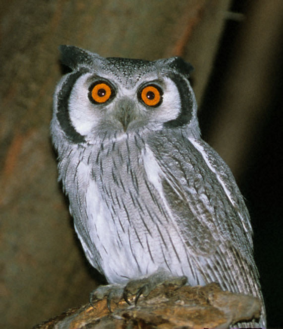 This picture of a Whitefaced Owl was taken at night with flash. Its food is rodents (incl. small squirrels), small mongooses, dove-sized birds, and insects, [South Zambezi NP, Zambia].