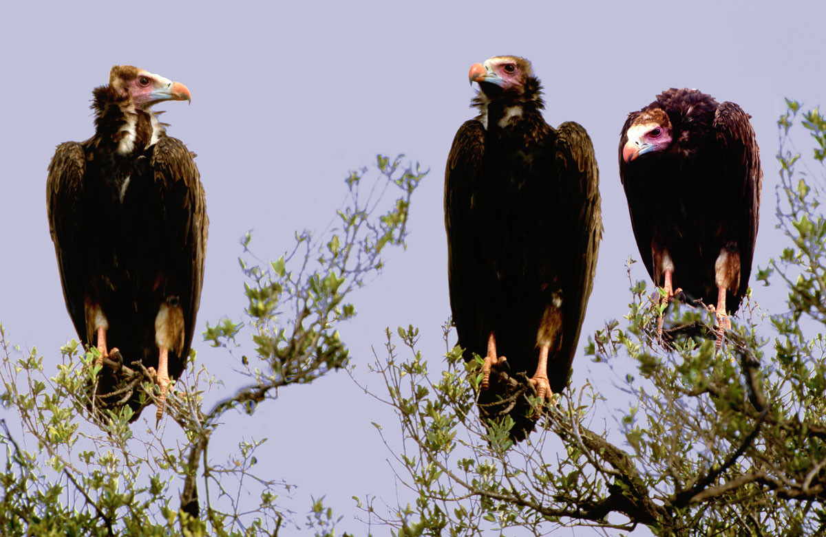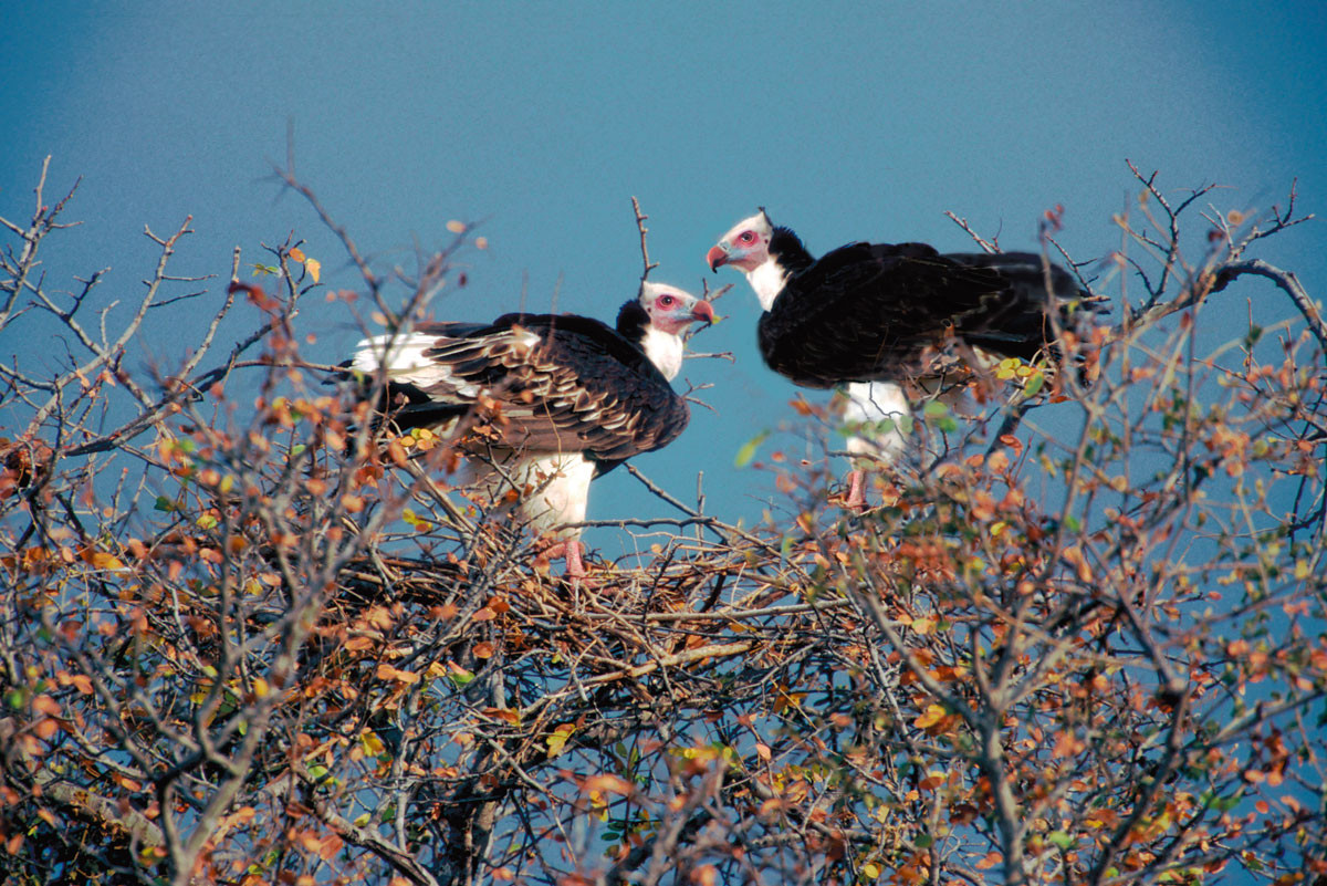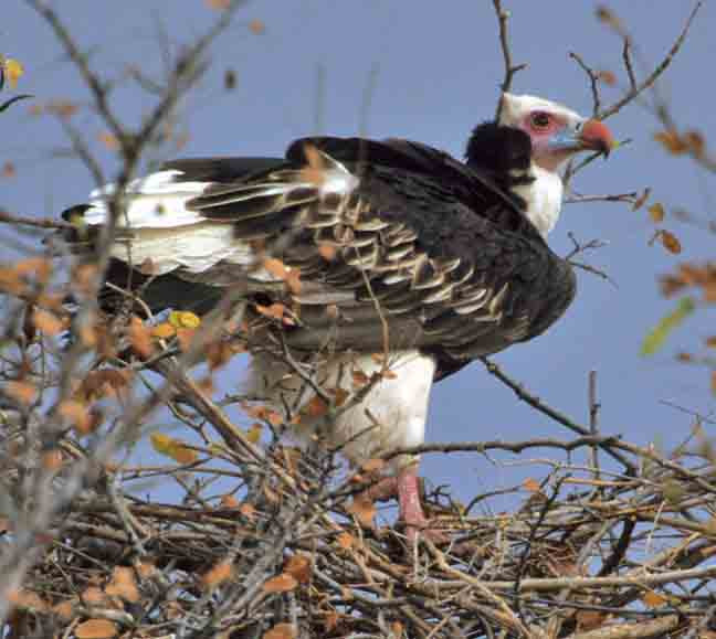The Whiteheaded Vulture is the most beautiful of the vultures. It is somewhat reclusive, very wary, and less numerous than the other vulture species in Southern Africa. We thought this was a female--with white inner secondaries--in her nest. The male flew off as we approached. [Chobe NP, Botswana].