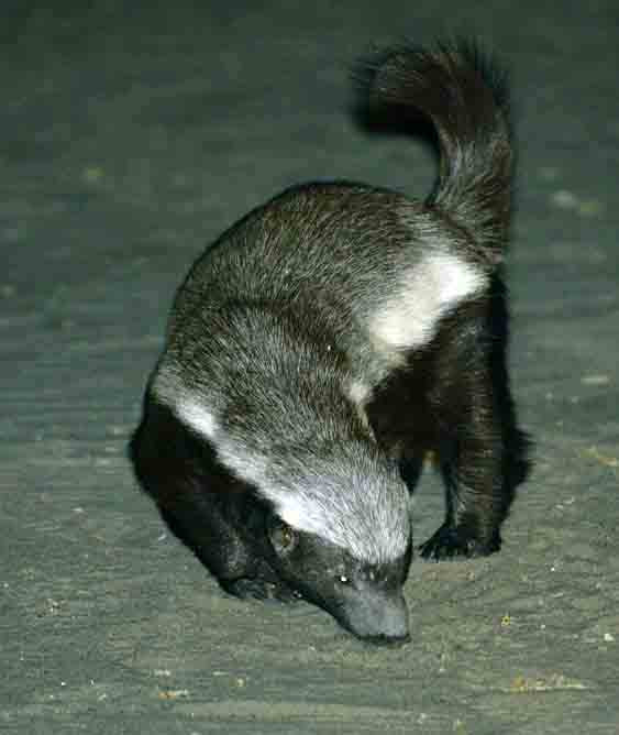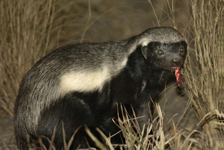 A Honey Badger can be a bold, vicious animal who frequently hunts at night. This one was attracted by the smell of our outdoor dinner. It can be quite fearless. I recall an incident where one crawled up on our pick-up truck that was parked in camp and had some food stored in the back. It tore open the food containers and ate all the food. (Please see previous caption). [Deception Valley, Botswana].