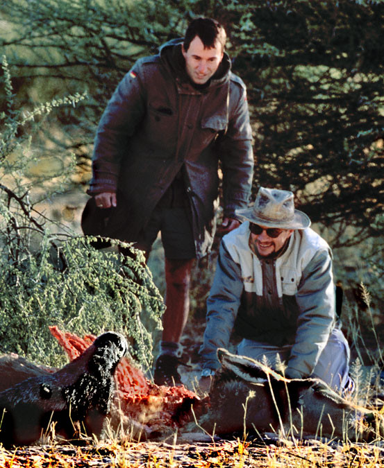 A Honey Badger attracted by some carrion who was reluctant to leave even when our host and my guide tested its tolerance of their close presence. He showed his confidence by not leaving until they crawled up within 3-1/2 feet of him. (Please see next and preceding images/texts. [Deception Valley, Botswana].