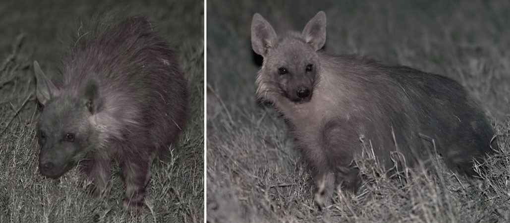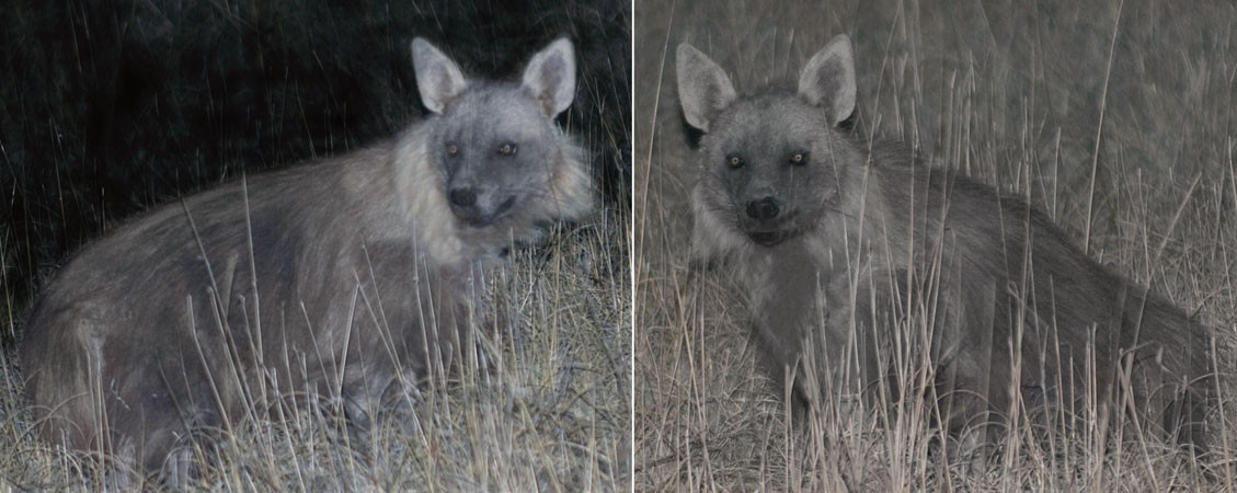 The male Brown Hyena-a double image of a frontal & side view. Night shots, unlike daylight pictures, don't show the subtle coloring of the fur. (Please see all the preceding captions for more information). [Botswana].