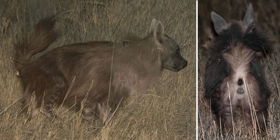 Brown Hyena Marking: The L image shows the small whitish bulge at the anus of one of the marking bladders which normally lies within the anus. The 'Brown' has two marking secretions, stored in 2 different pouches stored within the anus: one is black, and the other, white. The 'white' is less durable and seen usually on the stems of long grass. The black paste can be seen on a stem of grass, alone or with the white paste. [Jack's Camp, nr Central Kalahari, Botswana].