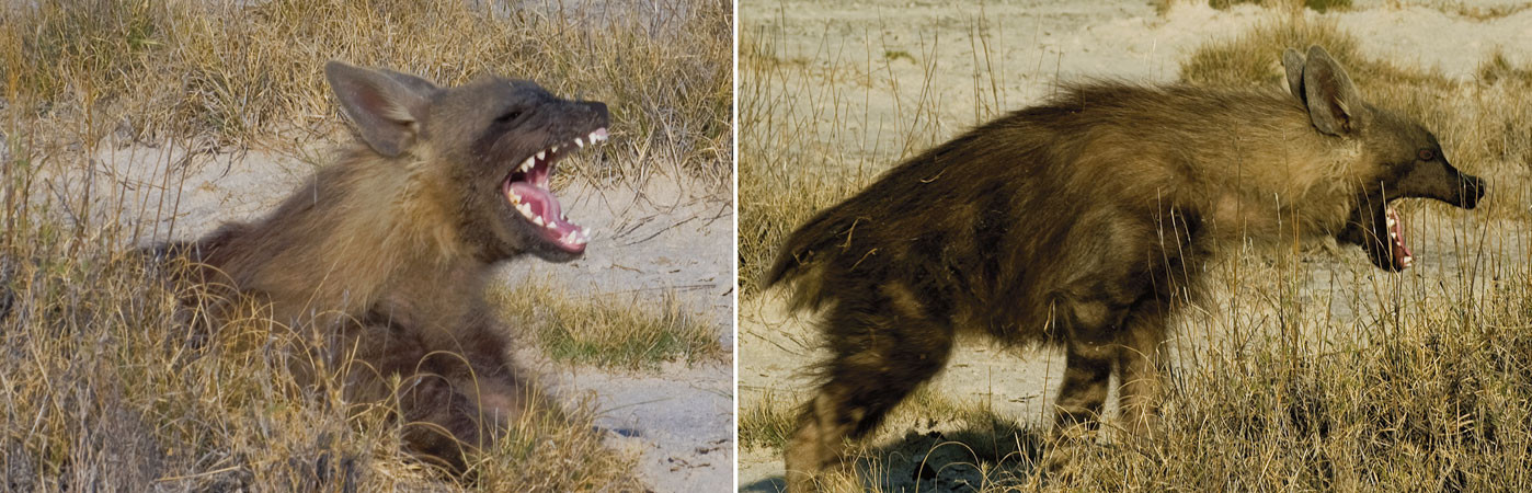A double image of a Brown Hyena yawning: Like its spotted cousin, the 'Brown' has very strong jaws and teeth. It can easily chew up--and digest--bone to get to the nutricious marrow. A 'Brown' rarely makes a kill of a herbivore-- it is not a cattle killer, as some farmers assert. An exceptional sense of smell enables it to detect carrion from a considerable distance, enabling it to be the first to arrive at a carcass. [Jack's Camp, nr Central Kalahari, Botswana].