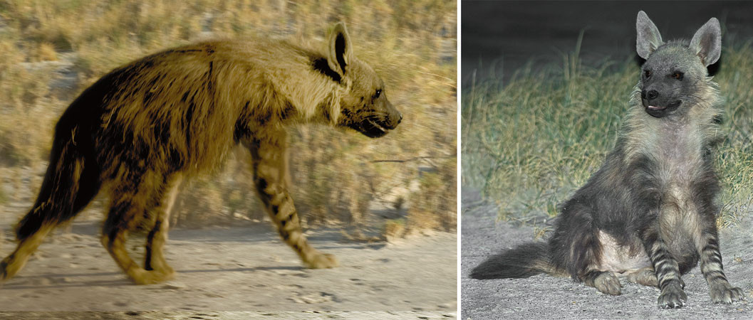 Double image of a Brown Hyena male, walking and sitting. The L image illustrating the posteriorly slanting body, characteristic of hyenas caused by the front legs being longer than the rear ones. R, the transverse black bars on the forelegs, typical of this species, is well shown. [Botswana].