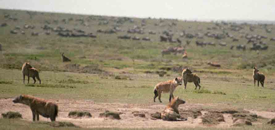 Spotted Hyenas at the wildebeest migration: The hyenas are waiting for the foaling to begin. After the wildbeests began birthing, the hyenas will make a feast of hundreds of the young. I remember seeing a large field strewn with at least 30 partially eaten newborn wildebeest carcasses. In this photo. The huge one in the left-foreground may well be a head-of-clan female. [Serengeti, Tanzania].