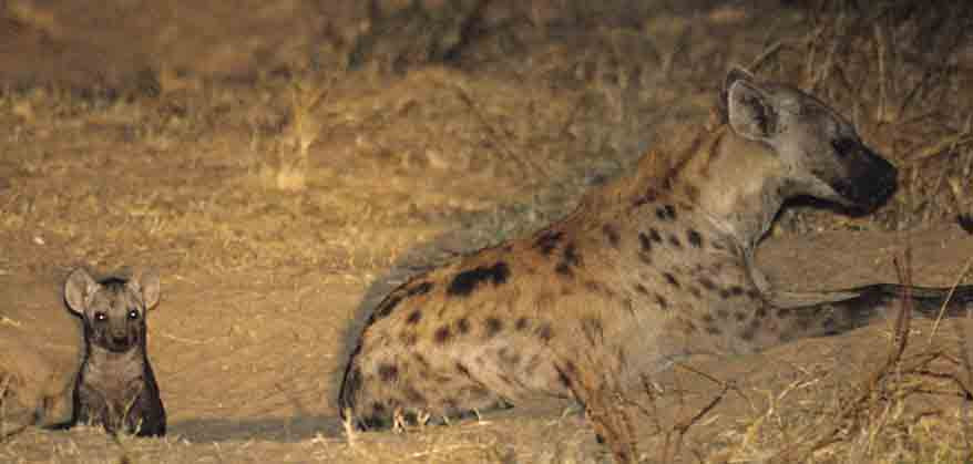 A very young baby (4-6 weeks) Spotted Hyena with its mother at the entrance to their burrow. Hyenas have superb night vision. Taken with flash. [S. Luangwa NP, Zambia].