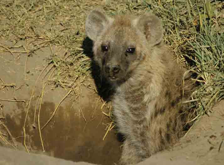 Spotted Hyena juvenile peering out of its burrow by the side of the road. Same individual as in previous image. [Serengeti, Tanzania].
